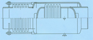 旁通軸向壓力平衡型膨脹節(jié)由兩個相同的波紋管及端環(huán)、封頭、外管等結(jié)構(gòu)組成,主要由位于兩端的兩個工作波紋管和位于中間的一個平衡波紋管及拉桿和端板等結(jié)構(gòu)件組成,主要用于吸收軸向位移并能平衡波紋管壓力推力的膨脹節(jié)。