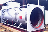 此類膨脹節(jié)的前部(通道端)有兩個工作波紋管,可以吸收來自彎管段產(chǎn)生的橫向位移;后部(平衡端)有一個平衡波紋管,它可以吸收來自直管段的軸向位移.當(dāng)彎管段產(chǎn)生橫向位移時,大拉桿上球螺母繞球面墊圈轉(zhuǎn)動,同時大拉桿承受內(nèi)壓的推力,因此該膨脹節(jié)常用于泵、罐、壓縮機(jī)、汽輪機(jī)出口處,以減少對上述設(shè)備的作用力。 四、安裝使用注意事項: