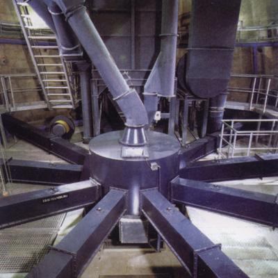 均化庫庫頂布料一般選用圓柱形生料分配器,該分配器充氣室用兩層滌綸纖維作充氣材料,以中壓離心鼓風機供氣。經(jīng)流態(tài)化的生料由生料分配器通過斜槽多點均勻入庫。