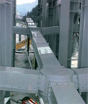 斜槽主要構(gòu)件是透氣層,本系列設計中采用的柔性厚型板式合成纖維織物,是一種新型透氣層,它具有耐高溫(可達150℃)耐腐蝕,耐磨損,吸濕性低,重量輕,表面平整,使用壽命長等優(yōu)點。透氣層無需現(xiàn)場安裝,每節(jié)槽體由制造廠組裝后,現(xiàn)場對接起來即可,這樣既減少了安裝工作量,又保證了質(zhì)量。