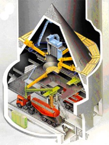 IBAU均化庫采用德國漢堡公司的連續(xù)均化技術(shù)。在外部帶一攪拌倉,庫底中心設(shè)一大圓錐,庫內(nèi)生料的重量通過該錐傳遞給庫壁,庫底環(huán)形空間被分成向中心傾斜10度的6個充氣區(qū),每區(qū)裝設(shè)3種規(guī)格的6個充氣箱。充氣卸料時生料先被送至一條徑向布置的充氣箱上,再經(jīng)過錐體下部的出料口由空氣斜槽送入庫底中央4000mm計量倉中。卸料時,生料在自上而下的流動過程中,切割水平料層而產(chǎn)生重力混合 作用,進入攪拌倉后又連續(xù)充氣攪拌而得到進一步均化,均化效果H可達6~8,電耗0.1~0.2Kwh/t生料。